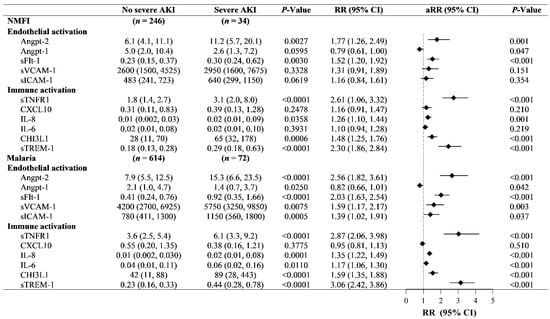 Forest plot biomarkers of endothelial and immune activation in children with severe AKI in the context of malaria and non-malarial febrile illness (NMFI). Biomarker levels presented as median (IQR) based on AKI status. Risk ratio (RR) and 95% confidence intervals (CI) calculated using Poisson regression with robust variance estimates on log10 biomarker levels adjusting (aRR) for participant age and sex. Following adjustment for 22 comparisons, a p < 0.002 is considered significant.