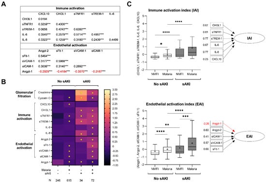 Relationship between host markers of kidney injury and differences in pathways of immune and endothelial activation. (A) Correlation matrix comparing biomarkers of immune activation and endothelial activation in the study population using Spearman rank correlation with Table presenting the rho value, and *** p < 0.001. Negative correlations are indicated in red. (B) Heatmap presents the mean standardized biomarker concentrations by malaria and AKI status (severe AKI (sAKI) vs. no severe AKI) with the number per group indicated. Biomarkers were categorized based on known biological function as markers of kidney function (glomerular filtration) or immune activation. Differences between groups were analyzed using linear regression with the standardized biomarker concentrations as the dependent variable and malaria and sAKI included as independent variables with an interaction term. The reference category included children without malaria (non-malarial febrile illness, NMFI) or severe AKI (sAKI, stage 2 or 3 AKI) and differences that were significant after adjusting for 36 multiple comparisons using the method of Benjamini–Hochberg false discovery rate were indicated by an asterisk. (C) Confirmatory factor analysis was used to derive an immune activation index (IAI) and an endothelial activation index (EAI). Differences in the indices were evaluated in children based on malaria and sAKI status using a one-way ANOVA with Sidak’s multiple comparison test where * adjusted p < 0.05, ** adjusted p < 0.01, **** adjusted p < 0.0001. The factor loadings for single principal components factor model with orthogonal rotation are presented beneath the Tukey’s boxplots with the mean presented (+).