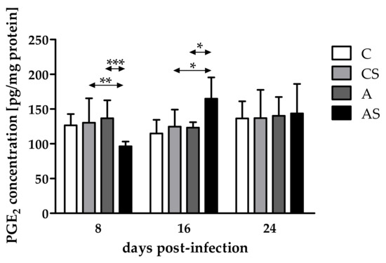 Concentrations of prostaglandin E2 (PGE2) in the eyes of mice at 8, 16, 24 days post Acanthamoeba spp. infection (dpi) related to immunological status of the host. Data represent mean ± standard deviation for six independent experiments (C, immunocompetent control, noninfected mice; CS, immunosuppressed control, noninfected mice; A, immunocompetent mice infected with Acanthamoeba spp.; AS, immunosuppressed mice infected with Acanthamoeba spp.; * statistical difference at p < 0.05; ** statistical difference at p < 0.01; *** statistical difference at p < 0.001).