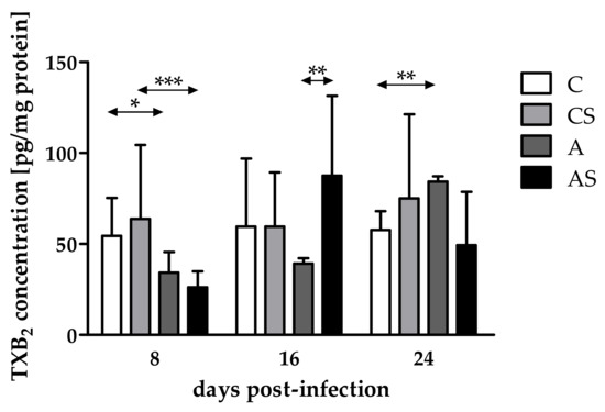 Concentrations of thromboxane B2 (TXB2) in the eyes of mice at 8, 16, 24 days post Acanthamoeba spp. infection (dpi) related to immunological status of the host. Data represent mean ± standard deviation for six independent experiments (C, immunocompetent control, noninfected mice; CS, immunosuppressed control, noninfected mice; A, immunocompetent mice infected with Acanthamoeba spp.; AS, immunosuppressed mice infected with Acanthamoeba spp.; * statistical difference at p < 0.05; ** statistical difference at p < 0.01; *** statistical difference at p < 0.001).