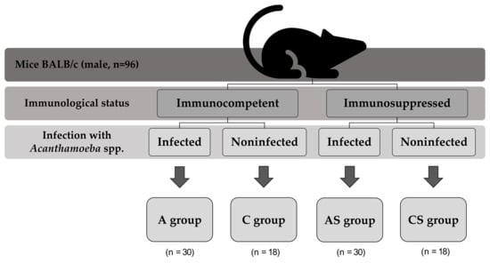 For four days prior to inoculation of mice with Acanthamoeba spp., AS and CS animals were administered 0.22 mg (10 mg/kg body weight, b.w.) of methylprednisolone dissolved in 0.1 mL of 0.1% saline to induce immunosuppression. Infections of A and AS groups were performed by intranasal inoculation with 3 µL of a suspension containing 10–20,000 amoebae in accordance with the animal model used by Górnik and Kuźna-Grygiel [48]. C and CS groups received 3 µL of saline (0.9% NaCl).