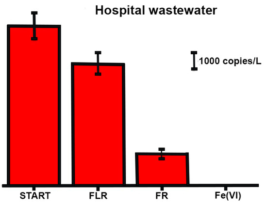 The significantly better ability to remove SARS-CoV-2 RNA from model water compared to hospital wastewater can be attributed to the fact that hospital wastewater, unlike model water, contains a large number of other substances, such as proteins, fats, polysaccharides, drugs and their metabolites and the like [28], with which ●OH radicals and ferrate (VI) can react and thus relatively reduce their efficiency of the SARS-CoV-2 RNA removal process (Figure 3 and Figure 4).