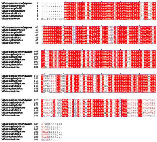 Multiple amino acid sequence alignments of VPA0041 proteins in Vibrios. Red rectangular frames indicate the homology of VPA0041 protein between V. parahaemolyticus and other Vibrios. The graphs show differences, and dots indicate missing residues.