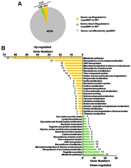 RNA-seq reveals the genes affected by vpa0041. (A) The pie chart shows the number of genes affected by vpa0041 according to ∆vpa0041 compared to WT cultured in BHI agar plates. (B) KEGG analysis reveals the different pathways associated with vpa0041 in ∆vpa0041 compared to WT. The orange shows the up-regulated genes; the green shows the down-regulated genes.