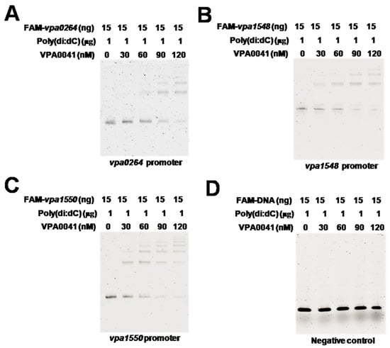 Thirty-eight lateral flagellar system genes were divided into 2 clusters located in chromosome II of V. parahaemolyticus [21]. Bioinformation analysis showed that the lateral flagellar system might contain nine promoters, shown in Figure 4A. The vpa0264-vpa0274 cluster, vpa1548 gene, and vpa1550-vpa1557 cluster were significantly down-regulated in the Δvpa0041 strain. EMSA results showed that the VPA0041 protein was directly bound to the promoter regions of vpa0264, vpa1548, and vpa1550 in a concentration-dependent manner (Figure 5A–C). The negative probe remained unbound with the highest concentration of VPA0041 protein (Figure 5D).