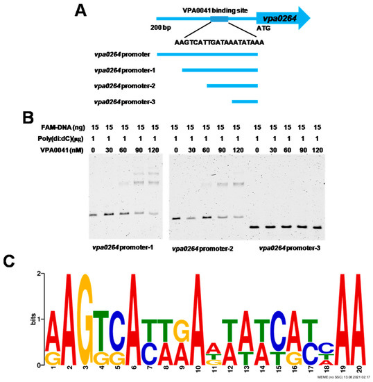 Identification of VPA0041-binding sites in the promoter of vpa0264. (A) The promoter region of vpa0264. Four DNA probes of the vpa0264 promoters were designed to analysis the binding sited of VPA0041. (B) EMSA analysis of VPA0041 binding sites with the various truncations. (C) The binding motif of VPA0041 protein generated by the MEME Suit tool.