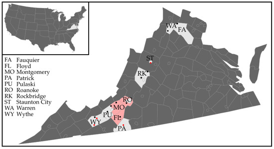 Map of study area in western Virginia. The black and red dots indicate the locations for each site sampled with established H. longicornis populations; red dots indicate sites where BRBV-positive ticks were detected. Counties shaded in pink had seropositive wildlife.