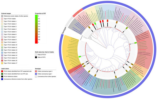 Phylogenetic analyses of FCoV strains on the basis of the partial S gene. The red dot diagram represents the 85 FCoV strains identified in our study. The number of FIP cats that tested positive based on part of the S gene for type I FCoV was 18 in this study. The number of FIP isolates obtained from GenBank for type I FCoV was 24. The number of FIP cats obtained from GenBank for type II FCoV was 3. The number of non-FIP cats that tested positive based on part of the S gene for type I FCoV was 67 in this study. The number of non-FIP cats obtained from GenBank for type I FCoV was 21. The number of non-FIP cats obtained from GenBank for type II FCoV was 3. The referenced strain-related gene bank number is provided in Table S4 of the Supplementary Materials. Color ranges: for the purpose of studying the genetic distance between different clades, the research has distinguished the different clades with different color ranges. In addition, reference strain clades of other species are marked in a gray color range. Label colors: the red font leaves represent the FCoV strains identified from FlP-suspected cats; the green font leaves represent the FCoV strains identified from non-FIP cats; the black font leaves represent the FCoV reference strains; the blue font leaves represent the coronavirus reference strains from other species. Serotype: in the outer circle of the phylogenetic tree lies the serotype of the coronavirus, which has been divided into three parts: feline coronavirus type II (red); feline coronavirus type I (purple) and coronaviruses from other species (gray). Proportion of FIP is presented as a histogram with black and white in each clade, above the bar value we show a green–red block to indicate the FIP prevalence of different clades. (Color figure can be viewed at https://raw.githubusercontent.com/lljjh/tree1/main/%E5%8F%91%E8%82%B2%E6%A0%91jpg.jpg.) (Accession date is after 1 January 2022).