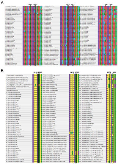 The mutation sites 23,531 and 23,537 of the detection results of nucleotide sequence translation of the fragments. (A) Alignment analyses of the nucleotide sequences of partial S genes between the identified FECV strains and FIPV strains. (B) Alignment analyses of the amino sequences of the corresponding partial S genes between the identified FECV strains and FIPV strains. The referenced strain-related gene bank number is provided in Table S4 of the Supplementary Materials. T: thymine; A: adenine.