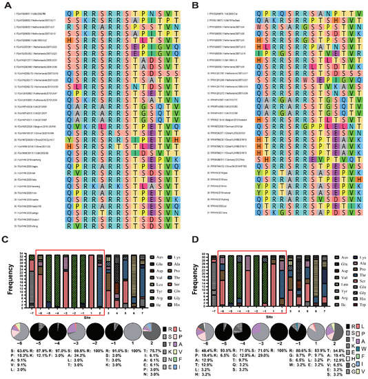 Sequence analysis of feline enteric coronavirus (FECV) and feline infectious peritonitis virus (FIPV) in the spike gene at the S1/S2 site. (A) Amino acid sequence alignment of feline enteric coronavirus (FECV) at the S1/S2 region of S proteins aligned by Geneious Primer. (B) Amino acid sequence alignment of feline infectious peritonitis virus (FIPV) at the S1/S2 region of S proteins aligned by Geneious Primer. (C) Sequence analysis of feline enteric coronavirus. The relative frequency with which an amino acid appears at the S1/S2 position is reflected by the color, as depicted by the scale bar. The pie chart represents the percentage of amino acid sequences in the S1/S2 region. (D) Sequence analysis of feline infectious peritonitis virus. The probability of amino acids is indicated by the size of the letters. The relative frequency with which an amino acid appears at the S1/S2 position is reflected by the color, as depicted by the scale bar. The pie chart represents the percentage of amino acid sequences in the S1/S2 region.