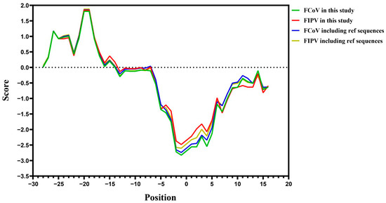 A line graph of the average hydrophobicity change at these sites is presented in Figure 4. Point 0 in Figure 4 represents the furin cleavage site. This indicated that, for both the data statistics in this study and the sequence statistics after combining with the reference sequence, in the −5 to +5 region of the figure, the value of FIPV is significantly higher than that of FCoV, which is a specific numerical reflection of hydrophobicity.