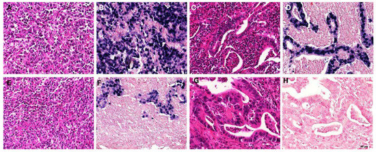 EBER staining patterns and morphology in gastric carcinomas. (A,B) “Lymphoepithelioma-like” morphology; EBER positive [(A) HE; (B) EBER-ISH], (C,D) “intestinal type” morphology, EBER positive [(C) HE; (D) EBER-ISH]; (E,F) “lymphoepithelioma-like” morphology; EBER negative in the tumour, but positive in accompanying lymphocytic infiltrate [(E) HE; (F) EBER-ISH]; (G,H) “intestinal-type” morphology, EBER negative [(G) HE; (H) EBER-ISH] (EBER, EBV-encoded small RNAs; ISH, in situ hybridization). https://www.researchgate.net/figure/Examples-of-EBER-staining-patterns-and-morphology-in-gastric-carcinomas-A-B_fig1_274722785 (accessed on 6 March 2022) [92].