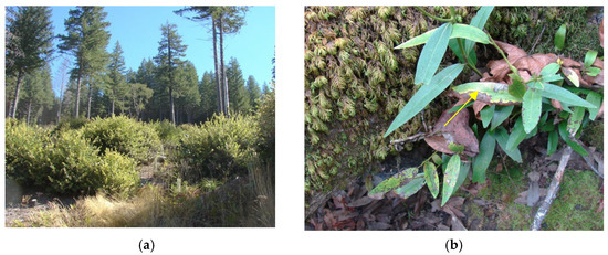 (a) Resprouting tanoak near Brookings, OR; (b) Phytophthora ramorum lesions on bay laurel resprouts (arrow).