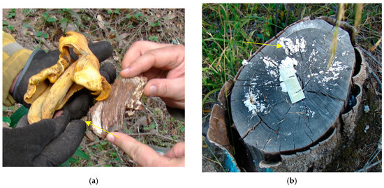 - Rayner, A.D.M. Fungal colonization of hardwood stumps from natural sources. II. Basidiomycetes. Trans. Br. Mycol. Soc. 1977, 69, 303–312. [Google Scholar] [CrossRef]