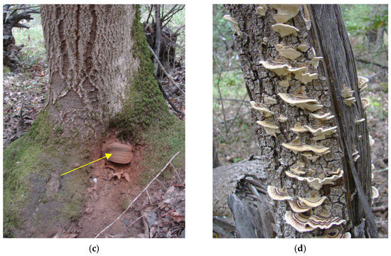 Fruiting bodies of decay fungi identified on tanoak stumps. (a) Trametes versicolor; (b) Lenzites betulina; (c) Chondrostereum purpureum (arrow) naturally occurring on tanoak log; (d) Chondrostereum purpureum (arrow) on treated stump.