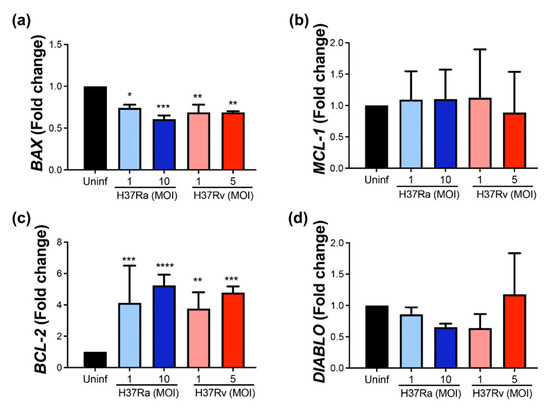 M. tb virulent and avirulent strains increase the gene expression of the anti-apoptotic BCL-2 and decrease the pro-apoptotic BAX. Human MDMs were obtained after seven days in culture. 2 × 106 MDMs were infected at MOI 1 and MOI 10 with an avirulent (H37Ra) and at MOI 1 and MOI 5 with a virulent (H37Rv) strain of M. tb; 2 × 106 MDMs were not infected as a control (Uninf). At 24 h postinfection, cells were recovered and prepared for qPCR. Relative expression of BCL-2 (a), MCL-1 (b), BAX (c), and DIABLO (d) genes was assessed using qPCR. Bar graphs show the mean ± SD from four independent experiments (n = 4 donors). Statistical analysis was performed using Kruskal–Wallis analysis, followed by Dunn’s post hoc test. * p < 0.05, ** p < 0.01, *** p < 0.001, **** p < 0.0001.