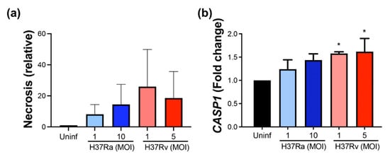 M. tb infection induces necrosis, and virulent M. tb increases further CASP1 expression. MDMs were obtained after seven days in culture. 2 × 106 MDMs were infected at MOI 1 and MOI 10 with an avirulent (H37Ra) and at MOI 1 y MOI 5 with a virulent (H37Rv) strain of M. tb 24 h postinfection cells were recovered and prepared for qPCR, and supernatant for ELISA. Histone-associated DNA fragments (mono- and oligonucleosomes) were quantified in supernatants. Results are shown as a relative increase compared with uninfected conditions. Necrosis was assessed by cell death detection ELISA (a) and relative gene expression of CASP1 gene by qPCR (b). Bar graphs show the mean ± SD from three donors performed with two technical replicates. Statistical analysis was performed using Kruskal–Wallis analysis, followed by Dunn’s post hoc test. * p < 0.05.