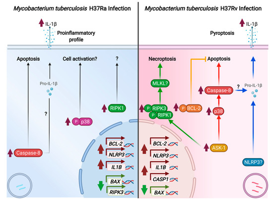In summary, our data showed that macrophages infected with the avirulent H37Ra strain exhibit increased caspase-8 and p-p38 levels and a pro-inflammatory microenvironment characterized by a high IL-1β level (Figure 9 left). On the contrary, infection with virulent H37Rv strain activates diverse cell death pathways, and this could be a strategy used by M. tb to warrant its survival. Herein, we found that virulent M. tb also activates multiple cell death mechanisms in the infected macrophage. In Figure 9 (right), our data show that H37Rv avoids BAX/BAK-mediated apoptosis, apparently via an increased level of p-BCL-2 (yellow line). Furthermore, ASK-1 kinase increases at the same time and can bind with diverse molecules and mediate diverse functions. In this way, while the ASK-1/p-p38 axis could facilitate the activation of caspase-8 and induce apoptosis (line red), ASK-1 could also activate the RIPK complex and mediate necroptosis (green line). Finally, we also observed an increase in the NLRP3 and CASP1 genes, together with the increased IL-1β both at transcriptional and protein levels; it is not surprising that it could mediate pyroptosis (blue line). In this process, IL-8 also could mediate IL-1β activation. In this study, we based our assessment of necrosis on the rupture of the plasma membrane, which is an event where several cell death pathways converge (even the apoptosis extrinsic pathway), leading to the release of cell components as fragmented DNA, and whose validity as a general marker of cell death has been proposed in previous reports [56]. Together, our results show that M. tb infection induces cell death, and the necrosis observed could be the result of both necroptosis and pyroptosis. It is noteworthy that pyroptosis, specifically, could be favored by M. tb virulence.