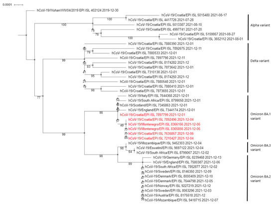 Phylogenetic analysis of the sequenced samples, presented in the form of a cladogram in Figure 1, showed that the Omicron variants detected in the Montenegro patients were closely related to the first Croatian case, confirming the connection with the Zagreb workshop outbreak and rapid cross-border infection.