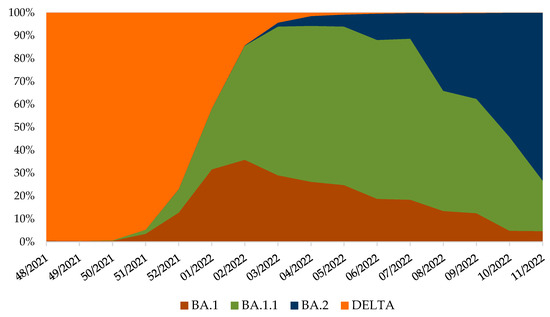 Variant frequencies in Croatia, from week 48/2021 until 11/2022, normalised to 100% [21,22,23,24]. SARS-CoV-2 positive samples were collected through routine genomic monitoring of SARS-CoV-2 in collaboration with ECDC [28] and uploaded to the GISAID database [21,22,23,24].