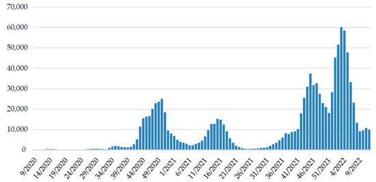 The weekly trend of SARS-CoV-2 positive cases in Croatia since the beginning of the epidemic. Data on positive patients are collected daily from all testing facilities through the central platform for COVID-19 testing registration [29] by the Croatian Institute of Public Health and reported on a website [30].