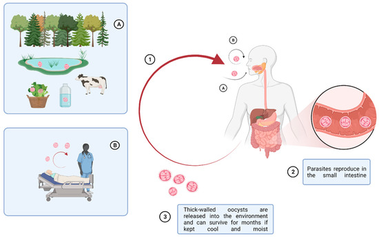 Multiple factors affecting the routes of Cryptosporidium spp. infection cycle. Zoonotic Cryptosporidium parasites are transmitted from livestock through long-lived oocysts in their faces, which can contaminate the environment, water, and food, producing a source of infection to people. Besides water- and food-borne transmissions, inhalation of oocysts has been described as another mode of transmission. (1) oocyst ingestion by (A) fecal-oral route and (B) inhalation; (2) parasite reproduction in the small intestine; (3) release of oocysts in the environment. This picture was created with BioRender.com accessed on 20 May 2019.