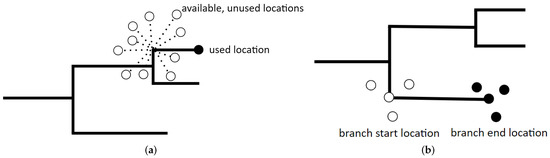 Diagrams depicting (a) the step selection function (SSF) model and (b) the resource gradient function (RGF) models used in this study. Both models have a binary response variable, depicted here by black and white circles. SSF models describe differences between used locations (black circles) and n = 10 available, unused locations per used location (white circles). RGF models describe differences between the areas where branches start locations (white circles) and where branches end location (black circles).