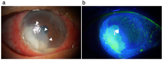 Corneal lesion at the first consultation. (a). Severe hyperemia, stromal infiltration (arrowheads), epithelial defect, and hypopyon are shown. (b). Fluorescein staining defines the area of the epithelial defect.