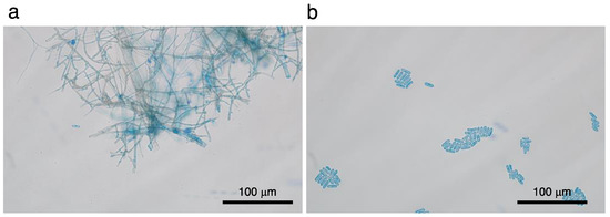 Detection of Colletotrichum gloeosporioides. (a). Filamentous fungus is detected from the lesion. (b). Biological culture allows the growth of Colletotrichum gloeosporioides. Bar, 100 μm (a,b).