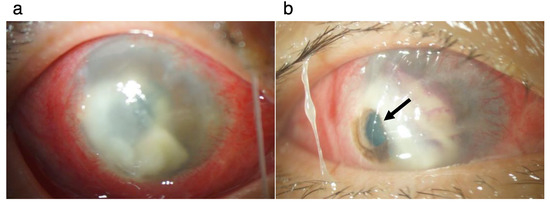 Findings in the anterior segment before therapeutic penetrating keratoplasty. (a). At 4 days after the first consultation, the lesion in the cornea is enlarged compared with that at the first consultation shown in Figure 1. (b). Perforation (arrow) of the cornea is observed in the inferotemporal area.