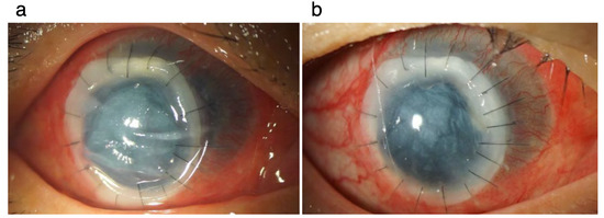 Findings after therapeutic penetrating keratoplasty at day 1 and 3 weeks. The graft is well suture-fixated to the affected cornea, although stromal edema is observed at day 1 after operation. At week 3, stromal edema of the graft seems to be reduced.