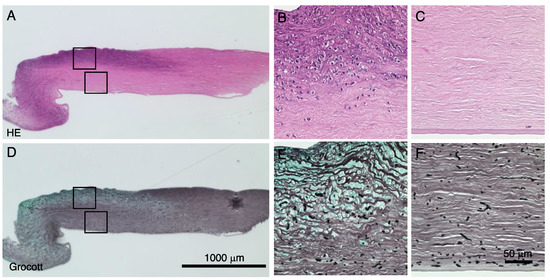 Histopathology of the affected corneal tissue. Hematoxylin and eosin (HE) staining (A–C) and Grocott + light green staining (D–F) for fungi detection are shown. Inflammation and fungus invasion were observed throughout the full thickness of the stroma around the ulcer perforation and in the anterior stroma apart from the ulceration (A,D). Higher magnification observation shows inflammatory cells and that fungi are invading the collagen fibers of the stroma. Bar, 100 μm (A,D); 50 μm (B,C,E,F).