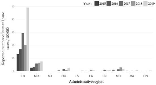 Reported number of human Lyme disease cases per 100,000 population for each region from 2015 to 2019. Legend: ES: Estrie; MR: Montérégie; MT: Montreal; OU: Outaouais; LV: Laval; LA: Laurentides; LN: Lanaudière; MC: Mauricie et Centre-du-Québec; CA: Chaudière-Appalaches; CN: Capitale-Nationale.