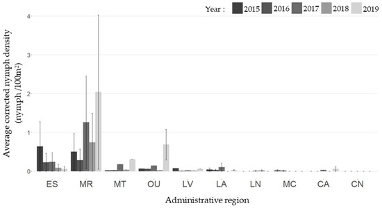 Average nymph densities per year in each MSSS, corrected for the 15th of June using seasonality models [25]. Legend: ES: Estrie; MR: Montérégie; MT: Montreal; OU: Outaouais; LV: Laval; LA: Laurentides; LN: Lanaudière; MC: Mauricie et Centre-du-Québec; CA: Chaudière-Appalaches; CN: Capitale-Nationale.