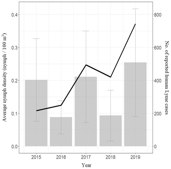 Diagram comparing average nymph densities at the provincial level from 2015 to 2019 (bars) with confidence intervals, with observed number of human cases (line).