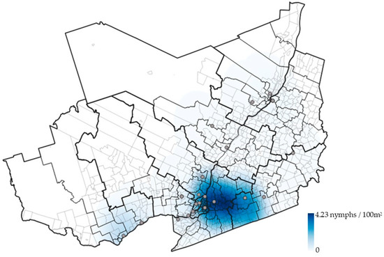 Interpolated enzootic risk for Lyme disease across the study zone (southern Quebec) for 2019; enzootic risk is derived from sentinel surveillance and interpolated using Kernel density estimation and reported as density of nymphs (DON) (nymph/100 m2). Sentinel site locations are represented using grey points.