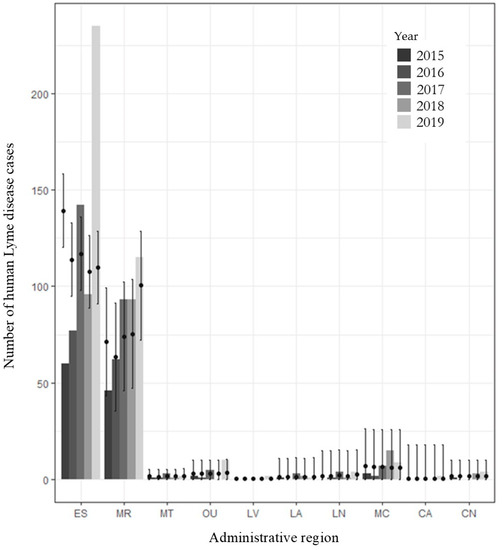 Comparison of model predictions of human LD cases (black dots) with confidence intervals, with observed number of human cases (bars) at the regional level across the study period from 2015 to 2019. Legend: ES: Estrie; MR: Montérégie; MT: Montréal; OU: Outaouais; LV: Laval; LA: Laurentides; LN: Lanaudière; MC: Mauricie et Centre-du-Québec; CA: Chaudière-Appalaches; CN: Capitale-Nationale.