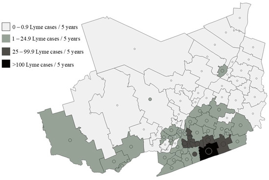 - Institut National de Santé Publique du Québec. Résultats de Surveillance de la Maladie de Lyme: Année 2019. 2020. Available online: https://www.inspq.qc.ca/zoonoses/maladie-de-lyme/resultats-de-surveillance-2019 (accessed on 8 February 2022).