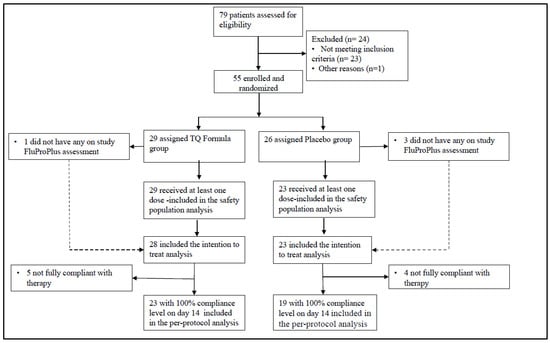 Between 27 May 2021, and 27 September 2021; 79 patients were screened for the randomized trial, of whom 24 were ineligible. All 55 randomized patients were analyzed based on an intent-to-treat analysis. The same analyses were repeated based on the per-protocol dataset requiring 100% compliance throughout the therapy as well as the full analysis dataset requiring that patients receive at least one dose of the study drug. The main study findings were consistent across these protocol-defined analysis sets. Figure 1 shows the trial participation profile.