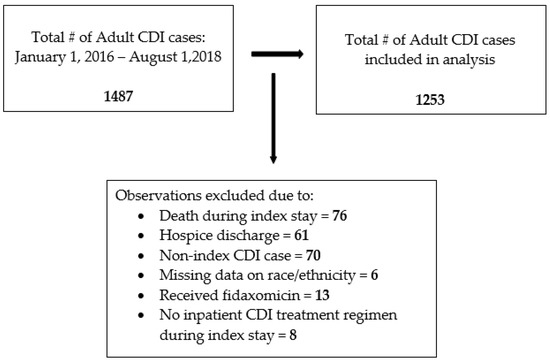 Between 1 January 2016 and 1 August 2018, a total of 1487 adult CDI cases were documented. A total of 1253 patients were included in the study after we excluded patients as described in Figure 1.