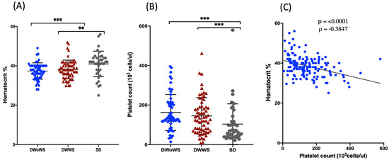 Hematocrit and platelet count in dengue patients stratified according to disease severity. (A) Hematocrit (%) and (B) platelet count (103 cells/μL) in patients with DWWS (n = 64, 38.3%), DWoWS (n = 64, 38.3%), and SD (n = 39, 23.3%). (C) Spearman’s rank correlation (⍴) between hematocrit and platelet counts. ** p < 0.01, *** p < 0.001 determined using the Mann–Whitney U test.