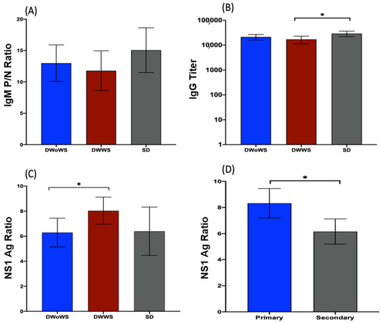 We detected no significant differences between the DWoWS, DWWS, and SD groups for the IgM P/N ratio (Figure 2A) or NS1 Ag ratio (Figure 2C). However, the mean IgG titer was significantly higher in the SD group than in the DWWS group, but not than that in the DWoWS group (Figure 2B), and the NS1 Ag ratio (level) was significantly higher in patients with serologically determined primary infection vs. secondary infection (Figure 2D).
