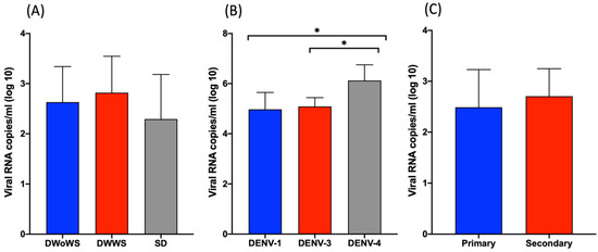 Viremia in dengue patients during the acute phase of infection. (A–C) Mean viral RNA load (copies/mL) in serum samples according to (A) disease severity, (B) DENV serotype, and (C), primary or secondary infection status. * p < 0.05 determined using the Mann–Whitney U test.