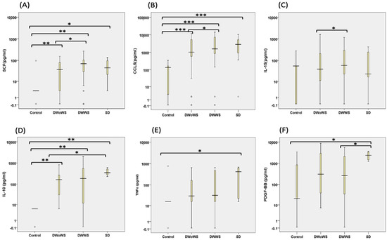 Serum cytokine levels in dengue patients during the acute phase of infection. (A–F) Cytokine levels in serum samples from healthy individuals (Control; n = 10) or patients with DWoWS (n = 64), DWWS (n = 64), and SD (n = 39). (A) SCF, (B) CCL5, (C) IL-15, (D) IL-10, (E) TNF-⍺, and (F) PDGF-BB. Circles represent samples outliers to the median value. Box plots show the median and interquartile range. * p < 0.05, ** p < 0.01, *** p < 0.001 using MANCOVA (after controlling for Age, gender, days of fever and IgM) the Mann–Whitney U test.