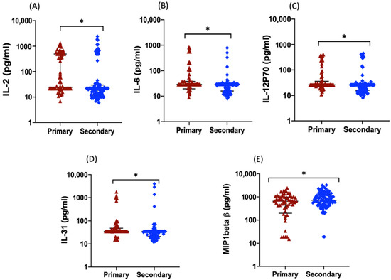 Serum cytokine levels in dengue patients stratified by primary and secondary infection. (A) IL-2, (B) IL-6, (C) IL-31, (D) IL-12p70, and (E) MIP-1β. * p < 0.05 as determined by using the Mann–Whitney U test.