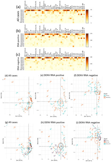 A total of 3 principal components were extracted, accounting for 60.8% of variation in the data (Figure S3). In terms of percentage contribution, there was no clear dominance by any cytokine in the first component despite the largest explained variance at 40.3% (Figure S4). The second and third component exhibited some overlap with considerable contributions from similar cytokines such as PIGF1 and CCL5 (Figure 6a–c and Figure S4). Based on this, the comparisons between components 2 and 3 were omitted in subsequent analyses. Additional subgroup analyses separating cases with positive and negative for DENV RNA were also performed (Figure 6d–i). The extracted principal components were first analyzed for the capacity of distinguish between primary and secondary infection cases and by disease severity (Figure 6d–f and Figure S5). While there was limited PCA distinction between the primary and secondary infections based on the selected components (Figure 6d–f), the data suggest that the first two principal components were able to distinguish cases by disease severity (Figure 6g–i and Figure S6), particularly among those that were negative for DENV RNA within different group means by severity (Figure 6i).