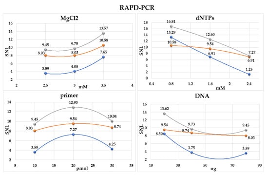 On the basis of the number of DNA fragments obtained in all experiments, we calculated the SNL (signal to noise ratio) for each level of each component (Table S1). The optimal concentration was determined as the highest SNL ratio among the levels (Figure 2). The concentrations of MgCl2 equal to 3.5 mM and of dNTPs equal to 0.8 mM were established as the most adequate. The increase in the MgCl2 concentration to the level of 3.5 mM and the decrease in dNTPs concentration to 0.8 mM caused a substantial increase in the SNL coefficient (Figure 2). The optimal concentration of a primer was determined as 20 pmol. It was found that the optimal concentration of a DNA template should be 20 ng (Figure 2). A distinct decrease in the number of amplification products obtained in the other tested conditions of the RAPD-PCR method indicates that the use of higher or lower concentrations of the reaction components is not recommended.