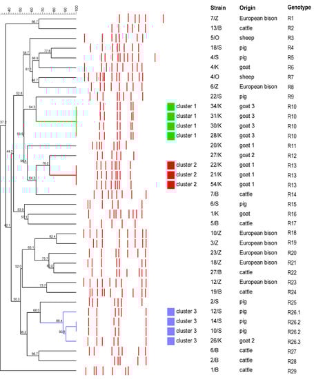 Most of the studied strains (n = 28) represented individual genotypes (R1–R9, R11 and R12, R14–R25, R26.1 and R26.3, and R27–R29). Based on the 100% of similarity, the remaining nine strains were allocated to three genotypes (R10, R13, and R26.2). The genotype R10 was the most prevalent and was found in four strains, followed by the R13 and R26.2 genotypes included in three and two strains, respectively. All strains having the R10 genotype (strains 28/K, 30/K, 31/K, and 34/K) were isolated from the same goat (goat 3). Similarly, all strains representing the R13 genotype (strains 21/K, 22/K, and 54/K) originated from the same goat (goat 1). Two swine strains (10/S and 14/S) had the same genotype R26.2. The dendrogram based on the analysis of RAPD-PCR results obtained for the studied T. pyogenes strains is presented in Figure 3. Considering genetic relationships between strains with more than 85% of similarity of the RAPD genotypes, three clusters were distinguished (Figure 3). Clusters 1 and 2, each grouped the caprine strains, indistinguishable by the RAPD-PCR genotyping, isolated from the same animals. Cluster 3 included three swine strains and one caprine strain, which belonged to three separate genotypes.