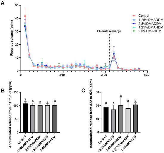 Fluoride release measurement. (A) The daily fluoride release curves. (B) Accumulation of initial fluoride release from d1 to d21. (C) Accumulation of fluoride re-release from d22 to d28. Data are presented as mean ± SD; n = 6. In plot (B,C), bars with the same letter indicate no significant difference between the groups (p > 0.05).