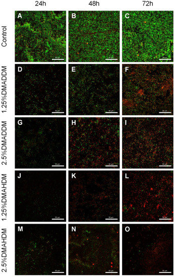 Representative live/dead staining images of S-ECC saliva-derived biofilms. (A–C) the control, (D–F) 1.25% DMADDM, (G–I) 2.5% DMADDM, (J–L) 1.25% DMAHDM and (M–O) 2.5% DMAHDM. Scale bars = 50 μm.